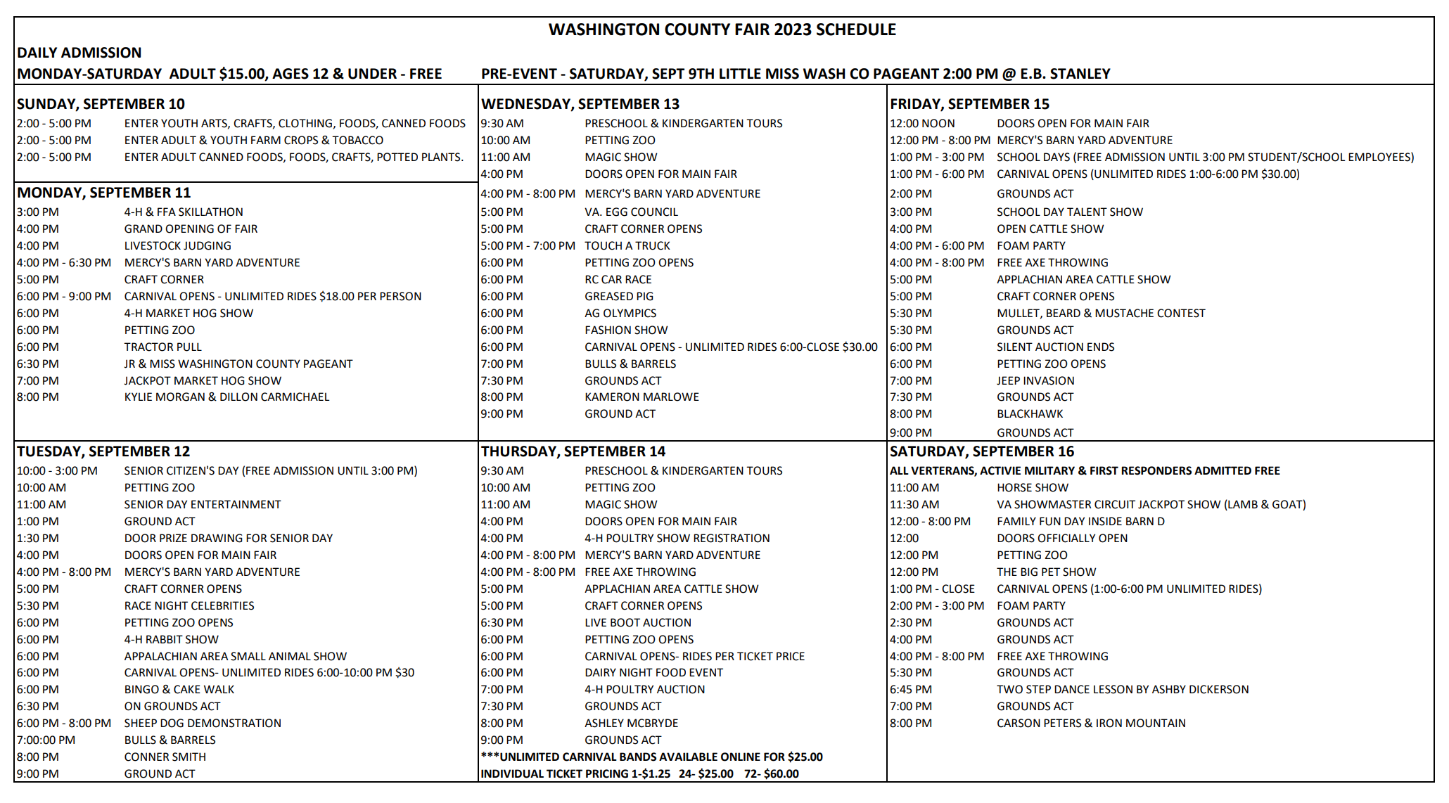 Returning Events: Jr. & Miss. Washington County Pageant, Mercy’s Barn Yard Adventure, Craft Corner, Petting Zoo, Tractor Pull, Horse Show, Hog, Cattle, Lamb & Goat Shows, Greased Pig, Concerts, Carnival, Egg & Dairy Nights, Silent Auctions, 50/50, Bingo, Home Economics Corners, Senior Day, and much, much, more.